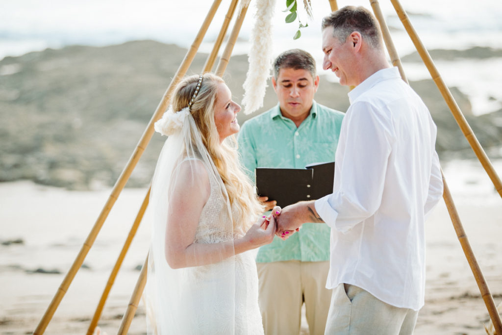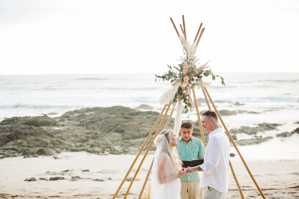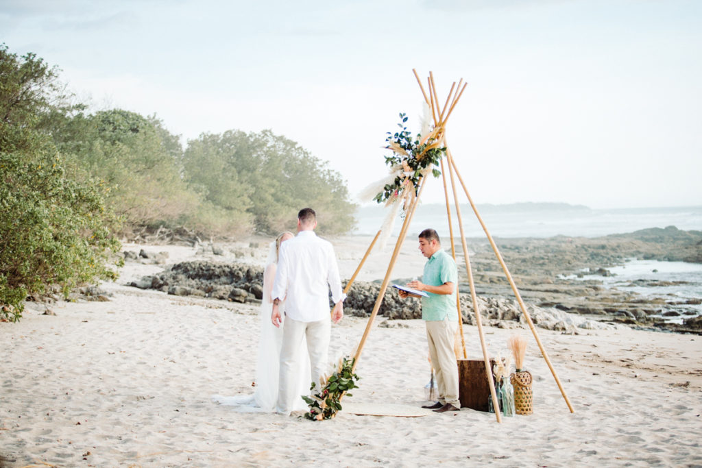 On the beaches of Playa Langosta, Costa Rica a little over a year ago it was a different scene, with Jeff nervously awaiting sunset to propose to Lisa… Cut to this day and their beautiful destination elopement Costa Rica, where on the same beach at Sueno del Mar they said “We Do”. With the help of Sol and her team at Sueno del Mar, the elopement was a romantic, bohemian dream elopement with teepee structures for both the altar and the reception dinner table, and Lisa looking gorgeous in her Emmy Mae dress.