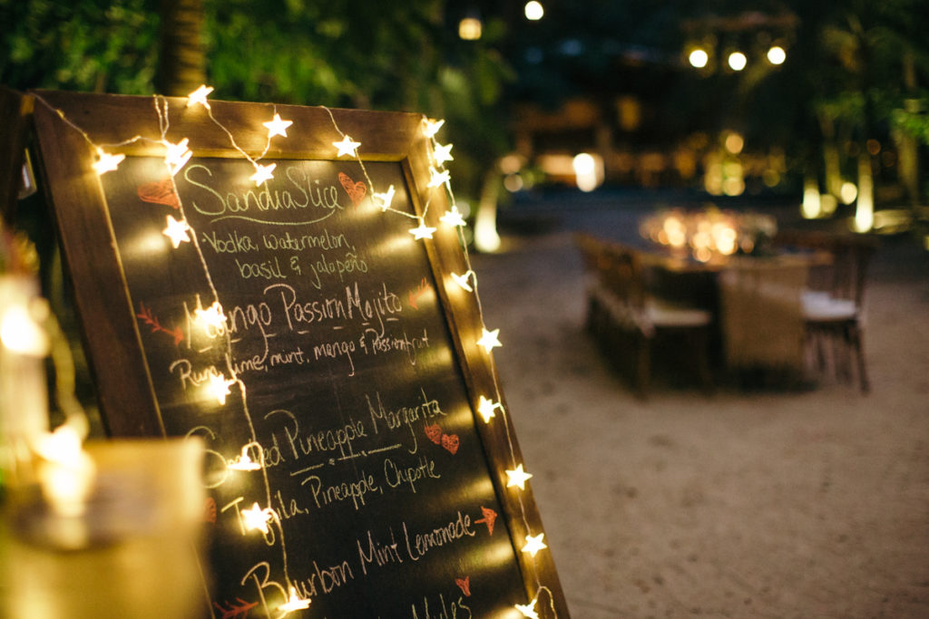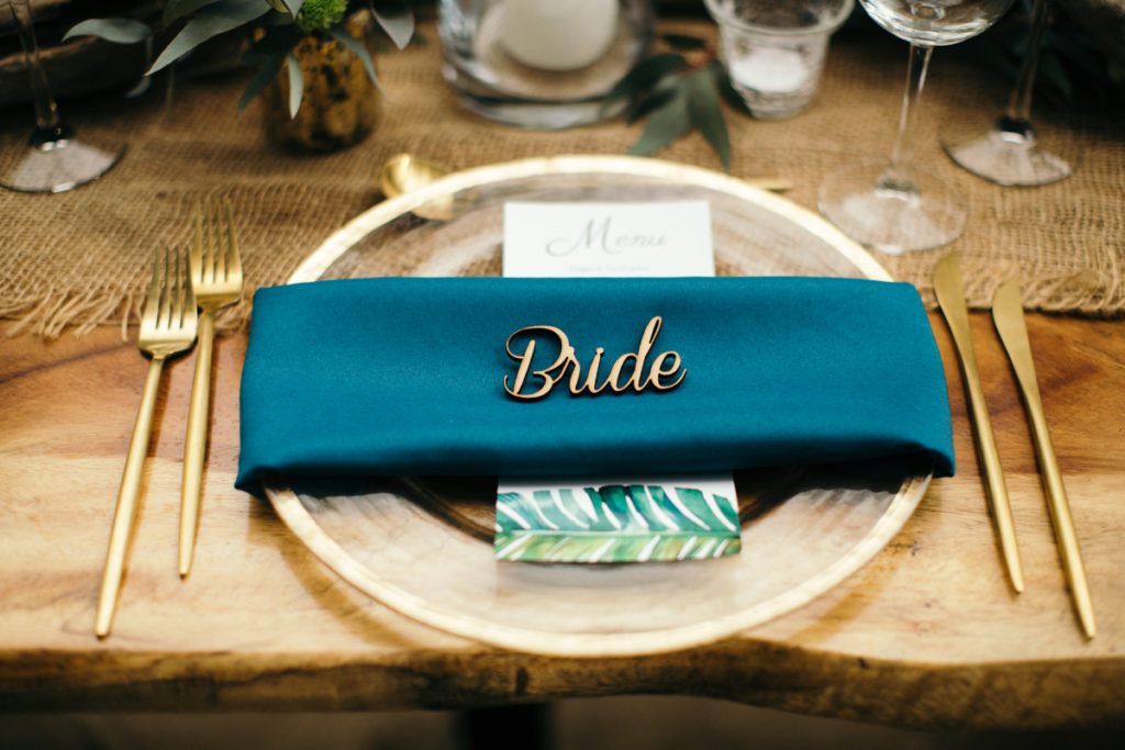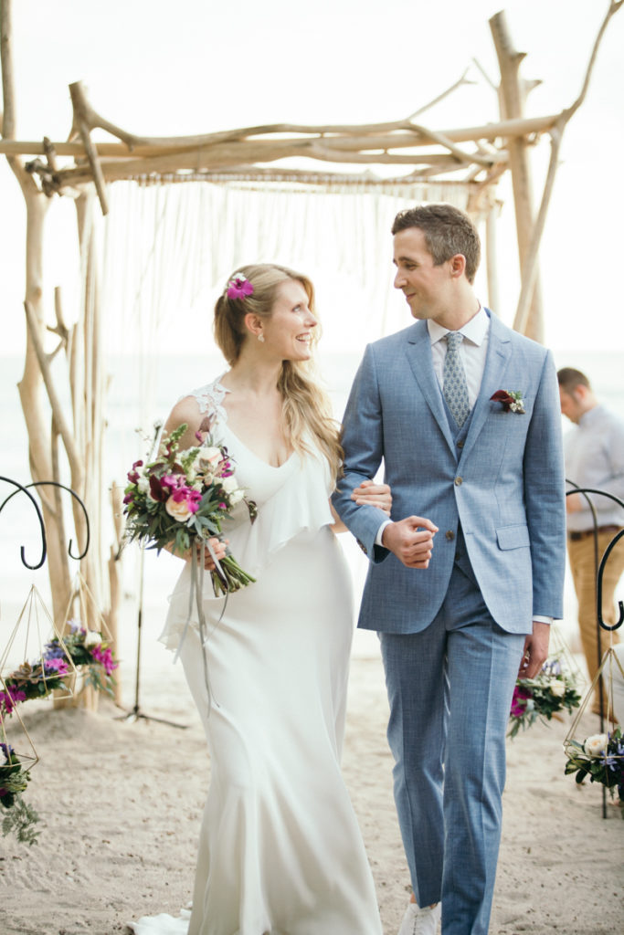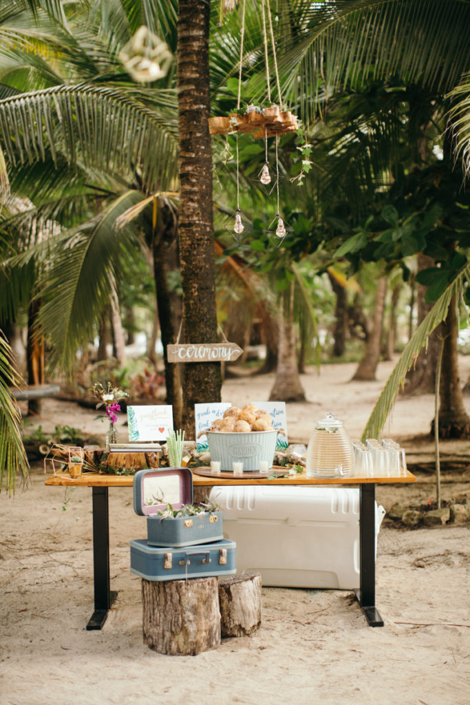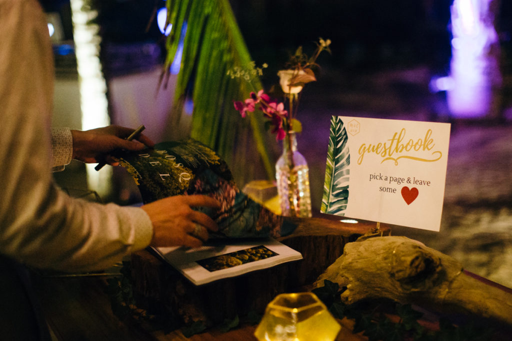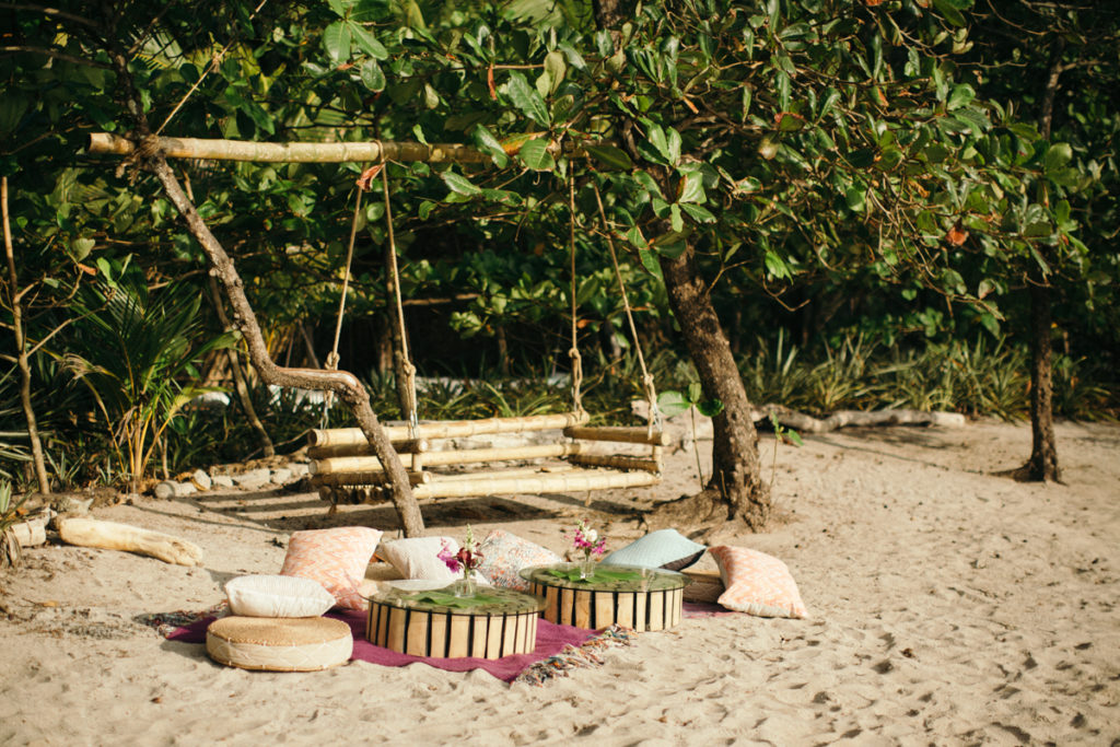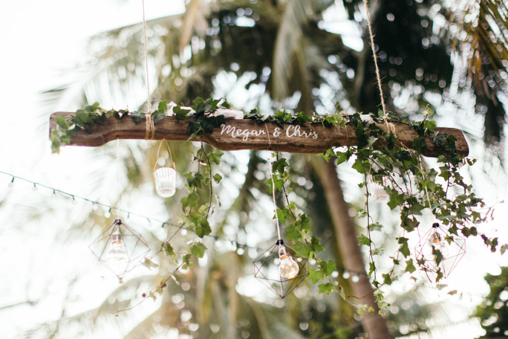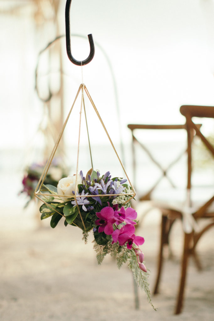 Megan worked closely with Marianne from Bliss Weddings Costa Rica to create a design that really brought out the couples’ interests and personalities. Design inspiration was drawn from numbers, lines and elegance as they opted to use unique geometric figures as the focal point of the décor. To represent their love for travel they incorporated vintage travel bags and a Costa Rican photo book as their guestbook. The non-uniform design and use of dark purples, greens and whites gave the event a very boho-inspired vibe and worked out to be the perfect combination!